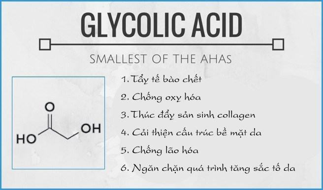 Glycolic Acid có công thức hóa học là C2H4O3 – đây là một trong những dẫn xuất của AHA (alpha hydroxy axit). Do có các phân tử nhỏ nhất, dễ tan trong nước và dễ dàng thẩm thấu sâu vào trong da, nên Glycolic Acid là loại AHA được sử dụng phổ biến nhất trong ngành mỹ phẩm.
