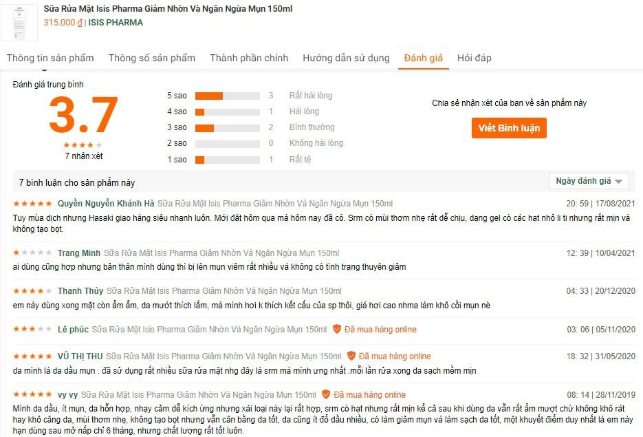Tại trang Hasaki – Trang mua sắm trực tuyến các sản phẩm chăm sóc sắc đẹp và sức khỏe toàn diện cho người Việt Nam được người dùng đánh giá hàng đầu hiện nay đã có nhiều phản hồi tích cực của khách hàng như: